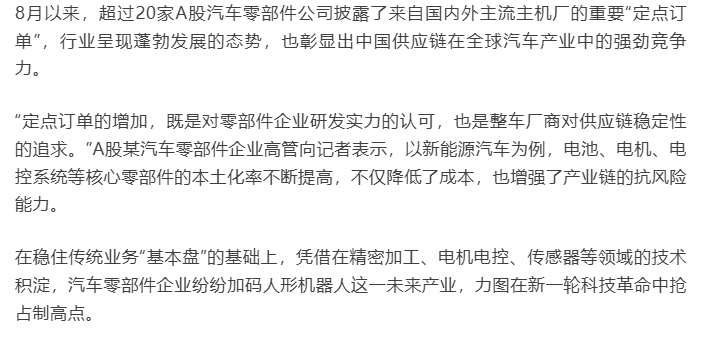 8月以来,超过20家A股汽车零部件公司披露了来自国内外主流主机厂的重要“定点订单”,行业呈现蓬勃发展的态势,也彰显出中国供应链在全球汽车产业中的强劲竞争力。“定点订单的增加,既是对零部件企业研发实力的认可,也是整车厂商对供应链稳定性的追求。”A股某汽车零部…